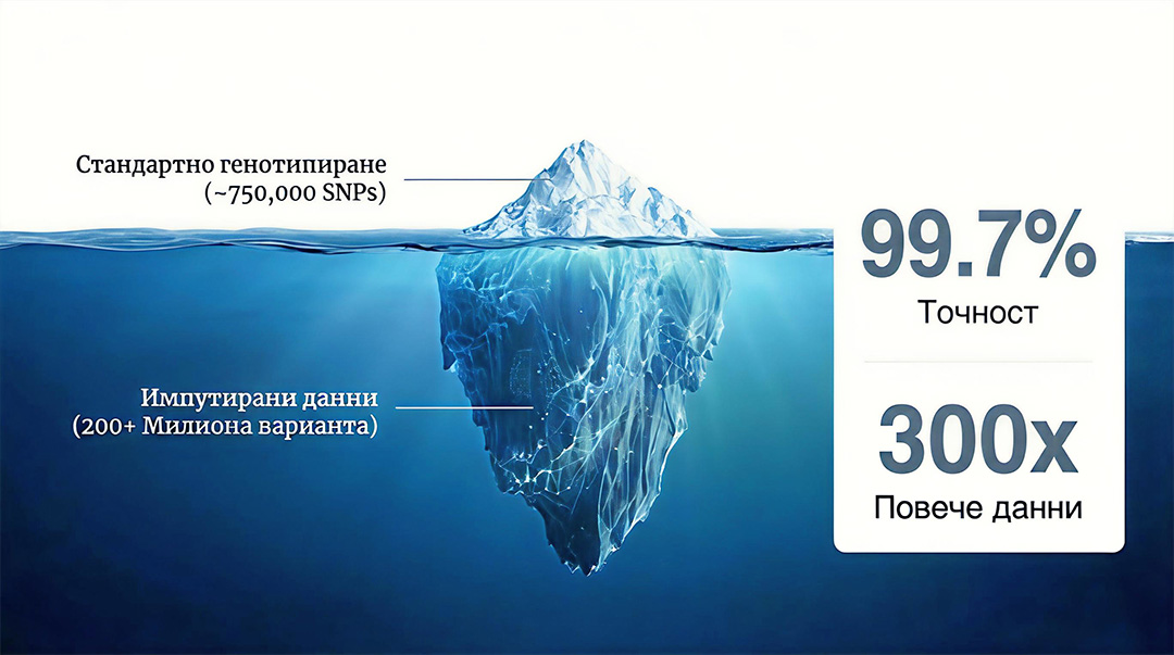 | Брой анализирани варианти (SNPs) | 83,000,000+ | ~650,000 |