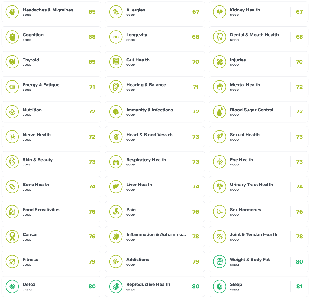 Вижте всички сфери на вашето здраве, които SelfDecode ще оптимизира за Вас.